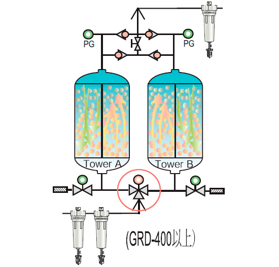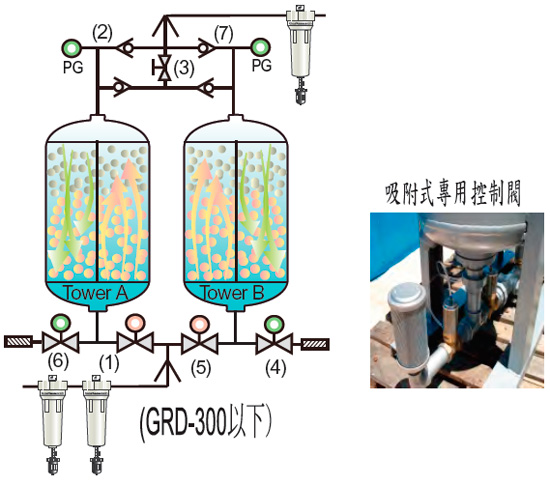 在目前台灣製造無熱型吸附式乾燥機廠商,大多採用ON/OFF雙動作電磁閥及逆止閥作為其入氣控制閥及單晶片控制器如左下流程圖所示,此設計在小型吸附式乾燥機系統及後端無須考慮安全供氣系統上,不會有任何問題產生。但是如在大型吸附式乾燥機系統採用如此設計就可能會產生安全操作問題,本公司設計人員經十多年設計化工機械經驗,已將大型吸附式(GRD-400以上)乾燥機之入氣控制閥修改為三通控制閥另外在配電盤控制上採用PLC可程式控制器並可選配觸摩控制的人機螢幕,如此一來可避免因入/出氣控制閥誤動作或者損壞時,造成需求氣源之後端現場或者機器因瞬間氣源斷絕產生安全操作的問題即可在購置發現有其他功能(如露點控制及顯示/經濟在生風量控制/入出氣壓力及溫度和流量檢知即顯示/RS485通訊設定),需求改變時可隨時更改程式及再附加控制元件改變其原始訂購時操作方式。